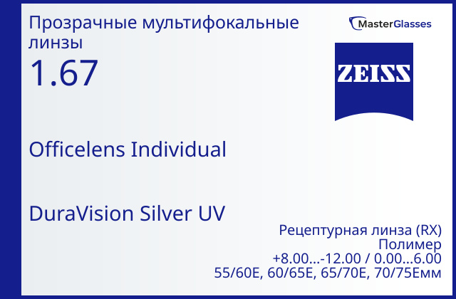 Офисная линза для очков Carl Zeiss Officelens Individual 1.67 DuraVision BlueProtect UV, рецептурная