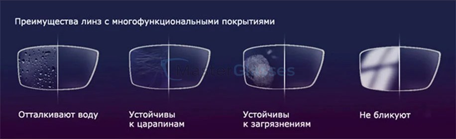 Покрытия SHMC: Многослойное просветляющее, абразивостойкое покрытие.Обладает антистатическими, супергидрофобными и олеофобными свойствами.